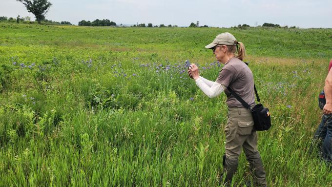 Left: Marge gets out on the trails as often as she can. (Photo by Kelly Sultzbach.) Right: To support citizen science, Marge often visits Holland Sand Prairie and documents local flora and fauna by uploading plant and insect photos to iNaturalist. (Photo by Karen Solverson)